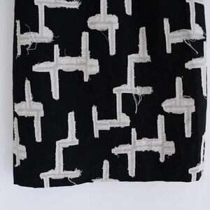 Contrast black and white boat neck dress made in Italian cotton blend textured fabric. Black and white fabrics contrast the top and bottom hemispheres of the dress with a notched detail at the waist. The double bell sleeve is bound in vegan leather. Perfect for work to after work, especially on presentation day. Made ethically in NYC by female owned production facilities.
