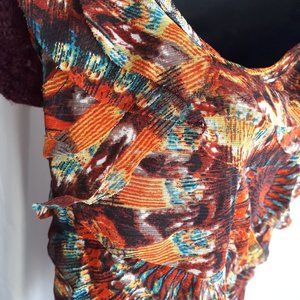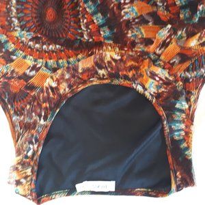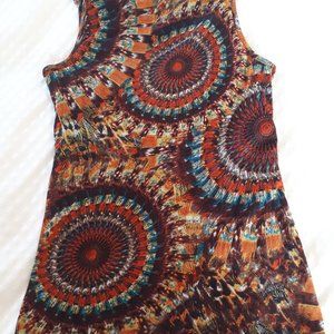 Fall theme. Colours featured in the tank top are browns, deep reds, orange, yellow, and teal in a circle pattern. Tasteful pattern and on of a kind!
