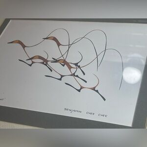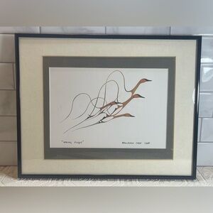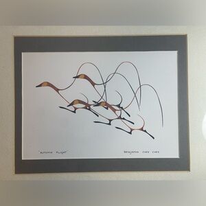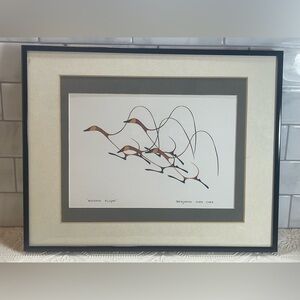 Celebrate the grace and movement of nature with this striking set of two framed prints by acclaimed Ojibwe artist Benjamin Chee Chee. Titled “Autumn Flight” and “Spring Flight,” these complementary works capture the elegant simplicity of Canadian geese in motion, reflecting the artist’s signature clean lines and minimalistic style.