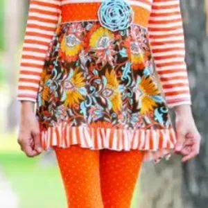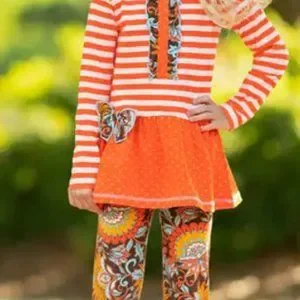 Top: Long-sleeve orange and white striped tunic with a floral ruffle detail at the neckline and a polka-dot peplum hem. Finished with a matching floral bow accent at the waist for a playful touch.