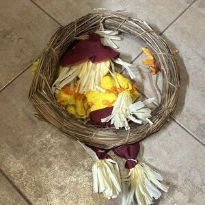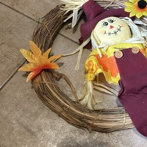Charming autumn wreath featuring a scarecrow with sunflower accents. Perfect for seasonal decor.