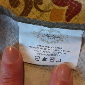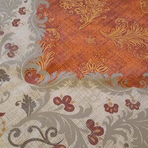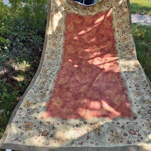 Preowned and great condition. Perfect for your Thanksgiving table! Beautiful shades of green, burgundy and burnt orange adds a seasonal fall atmosphere to your home. This is a large rectangle shaped tablecloth. The length is about 106 inches or 8.8 feet. The width is about 59 inches or 4.9 feet.