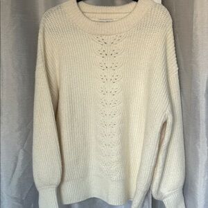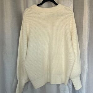 Soft and cozy knit sweater with beautiful details. Features a classic crew neck with ribbed hem and balloon sleeves. Perfect for layering. It is the coziest most amazing sweater but sadly too big for me now.
