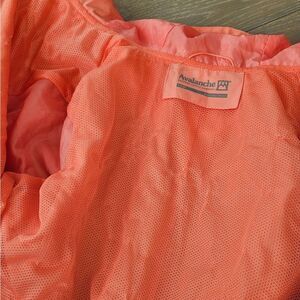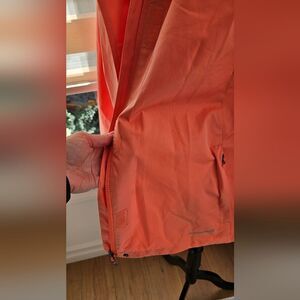 Bright coral jacket with hood. Lightweight and stylish. Ideal for skiing and snow activities. guc