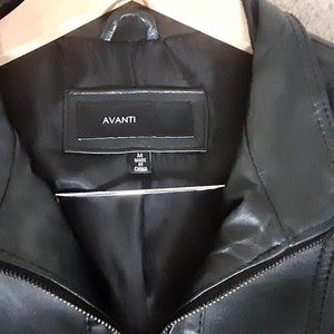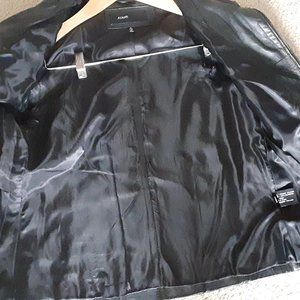 Black leather jacket in very good shape. No holes or rips. 2 zippered pockets in front. Tag says Size Medium but really fits like a Small.