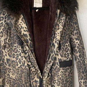Women’s Luxury “Avec Les Filles” Faux Fur Lined 3 In 1 Leopard Cotton Parka coat, Size Small. A small slit on the back at the hem for easy walking. Full zip with snap front buttons for closure. 2 snap front pockets, removable faux fur in side layer with zip. ORG $449.99.