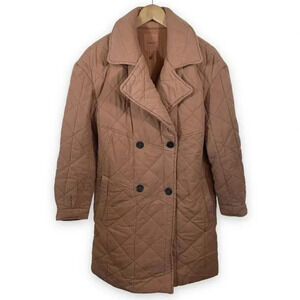 From Avec les Filles, the Washed Double Breasted Quilted Peacoat in a nice faded washed camel. Button closure. Side slant pockets. All over diamond quilted design. 37" length.
