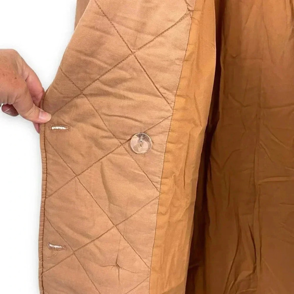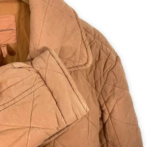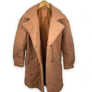 From Avec les Filles, the Washed Double Breasted Quilted Peacoat in a nice faded washed camel. Button closure. Side slant pockets. All over diamond quilted design. 37" length.