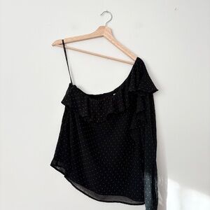 Swiss dot detailed ruffled one shoulder fully lined sheer blouse