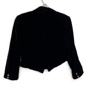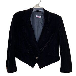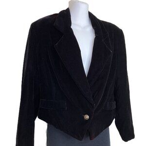 Vintage Avenue Road brand velvet short blazer jacket in a dark eggplant color - looks black in some lighting, but has a subtle brownish-purple hue to the fabric. Shorter cropped length, single button closure, decorative buttons at sleeve cuffs. Has shoulder pads. No size or fabric content tags, fits like a women's "Medium" - see below for garment measurements. Pre-owned condition: note that sleeve cuffs were folded under and stitched in place to shorten length. Could be easily un-stitched if longer length is needed. The pictures show the actual item that you will receive.