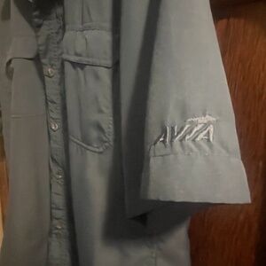 Short Sleeve button up Men’s Shirt has the safe pocket at the bottom left for secure storage of important items. Moisture wicking mesh around the upper back portion. Left front secret secure zippered pocket and left and right front secure pockets. Excellent condition. Medium blue color, appears grey in the photo!