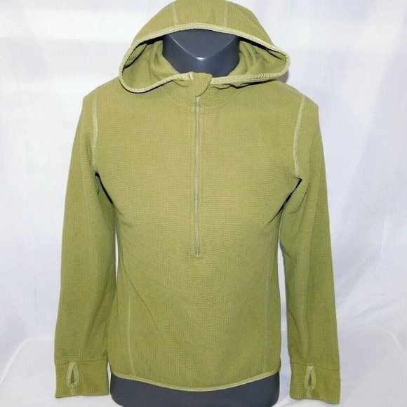 This AVIA Womens Large Olive Green Hoodied 1/4 Zip light Fleece active wear Hoodie with Thumb Holes is in good clean condition. Item is 60% Polyester and 40% outlast* Acrylic. Top measurements laying flat are:
