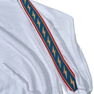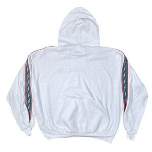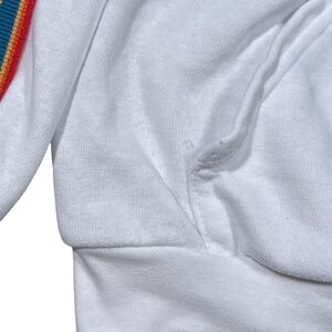 Stylish white hoodie with vibrant multicolor stripes on sleeves. Features Aviator Nation logo. Comfortable and trendy.