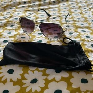 Silver tone aviator style sunglasses with silver rose decor on rims. Comes with soft black drawstring bag.