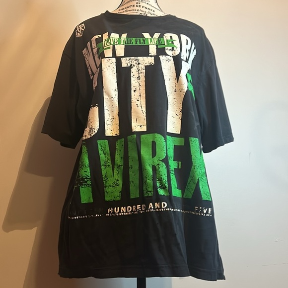 Show off your style with this Avirex New York City T-shirt. Featuring bold green and white graphics on a classic black background, this shirt is perfect for casual outings.