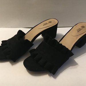 Stylish black sandals with ruffle detail. Comfortable block heel. Perfect for any occasion.