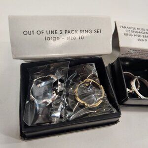 Includes Pernella earrings, Paradise Bliss engagement ring and band in size 9 with cubic zirconia stones and Out of Line ring 2-pack size 10. All brand new.