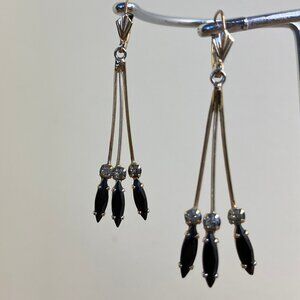 Vintage Avon gold-tone drop earrings have small clear crystals above the 3 black marquise shape crystals. Drop length is approx. 2", black crystals are approx. 3/8" long. Secure leverback ear wires. Side of leverbacks have "Avon" imprint. Good pre-owned condition: small surface marks from normal wear.