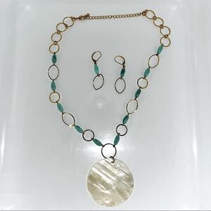 Avon GoldTone Link Necklace Earrings Green Oval Stones White Pearlescent Pendant