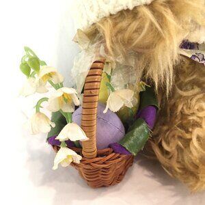 Violet is a sweet Avon Hat Box Teddy. I believe she is from the 1980's. She has a wicker basket with fabric eggs and flowers. It is still fixed to her hand with the original bubble wrap around it. She has her original hang tag with the certificate of adoption on the back. Her floral dress and sweater are removable. She is 12 inches tall.