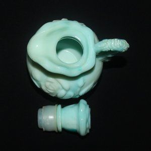 The pitcher's body, handle, and stopper are embossed with roses, stems, and leaves, as is the basin. The jadeite has a lovely marbled appearance. The pitcher stands 5" tall to the stopper and is 4" wide to the handle. The basin is 5" in diameter and is stamped "AVON" on the underside.