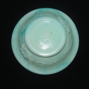 The pitcher's body, handle, and stopper are embossed with roses, stems, and leaves, as is the basin. The jadeite has a lovely marbled appearance. The pitcher stands 5" tall to the stopper and is 4" wide to the handle. The basin is 5" in diameter and is stamped "AVON" on the underside.