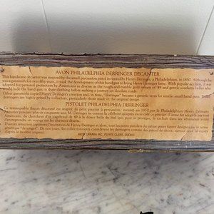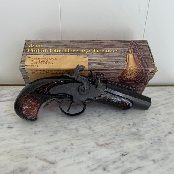 Avon vintage after shave decanter, Philadelphia Derringer Pistol Decanter. In good used condition, comes empty. Decanter is in good shape but box has some damage. Smoke free home.