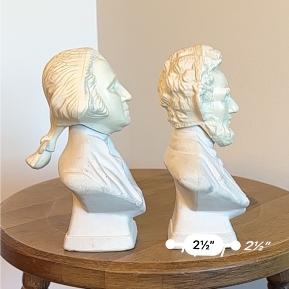 AVON brand aftershave bottles in the shape of busts of President George Washington and President Abraham Lincoln. Tai winds scent. 6oz bottles. White bottles. The heads are removable to be able to use the aftershave. The heads are discoloured and are cream now. There is still about 1/2-3/4 of aftershave left inside of each bottle. Approximate measurements can be seen in the attached listing photos. Each bottle has some wear, as seen in the listing photos.
