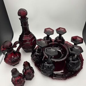 Elegant Avon dinnerware set in deep ruby red glass. Includes decanters and matching pieces. Perfect for dining decor.