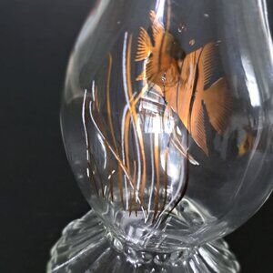 This is a vintage 70's Avon Sea Fantasy bottle/decanter with gold and white angel fish design. It's a clear glass, features a ribbed pedestal, and has a lovely, unique shell-shaped topper. It likely held some Avon fragrance or bath oil at some point and has a little discolouration at the bottom of the topper, likely from the product it once contained, as shown in pic 7. It is in excellent used condition and could be used as a bud vase or simply a decorative bottle. No apparent chips or cracks. It is about 7 inches tall excluding the shell topper.