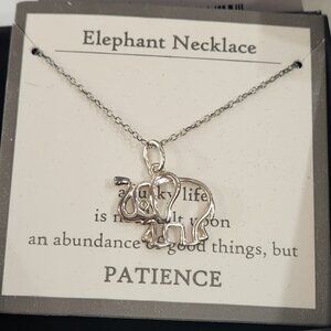 Includes Luxe semi-precious necklace, Infinite Meaning elephant necklace, Love is Kind necklace, and Blessed Guardian necklace. All brand new, but some show a bit of tarnish. Chains are about 18" long.