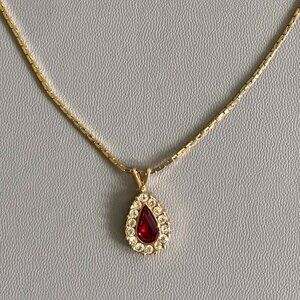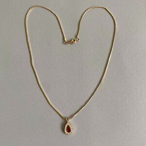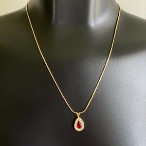 18" Long Avon Gold Tone VTG Cherry Red Teardrop Pendant Necklace. Cherry Red stone with clear rhinestones around. In Excellent preowned condition.