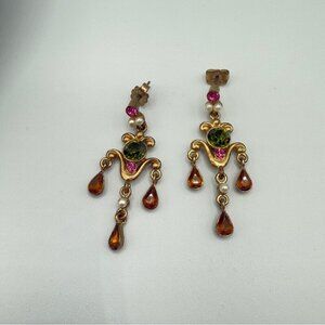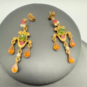 These vintage Avon earrings have a pretty antiqued gold tone finish with by vibrant green, pink and citrine orange rhinestones.