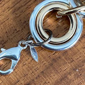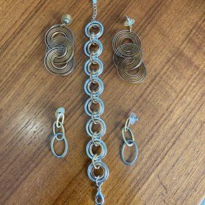 Includes vintage Avon gold and silver tone circle link bracelet, gold and silver spiral post earrings, and gold and silver chain post earrings. 1990s Avon (NWT Northwest Territories of Canada, an Avon Brand) Bracelet has a lobster claw clasp. The large circles are silver tone and the smaller circles are gold. It is 8" long with the extender and 3/4" wide.