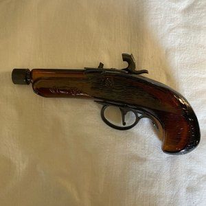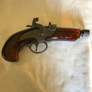 Avon Derringer Philadelphia pistol cologne/aftershave bottle. Amber glass with grey/brown hard plastic removable parts. Avon mark under firing mechanism. Vintage from the 1970s. Good condition. Empty but scent remains.