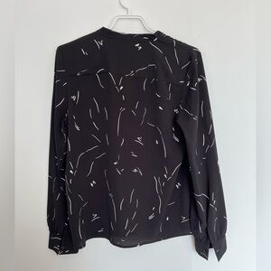 Chic black blouse with white abstract design. Button-up front. Long sleeves. Size small EUC