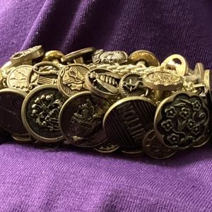 Unusual vintage stretch mesh bracelet with antique and vintage copper and plastic buttons. The mesh is gold tone. Beautiful!