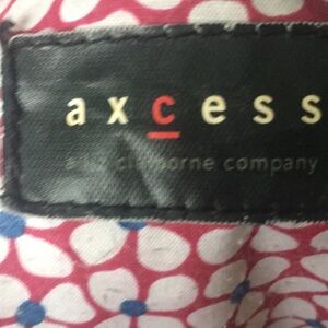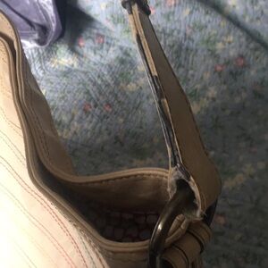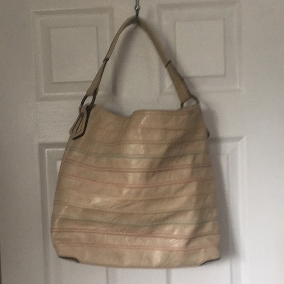 Large, beige purse with colourful stitching stripes. Floral interior. Axcess is by Liz Claiborne. Zipper and snap are good. Some wear on the strap. Needs a polish. Man made materials.