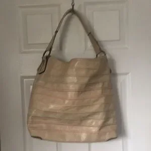 Large, beige purse with colourful stitching stripes. Floral interior. Axcess is by Liz Claiborne. Zipper and snap are good. Some wear on the strap. Needs a polish. Man made materials.