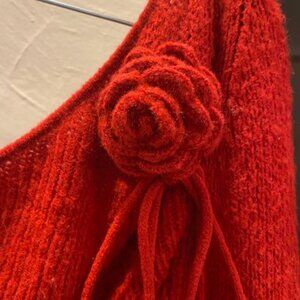 The Ayanna red sweater is an ultra-chic style for winter dinners and beyond. Crafted in an asymmetrical silhouette, this one sleeve sweater features ruching across the body and a fixed knit rosette bow detail at the shoulder.