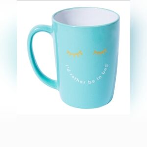 Pre-loved Ayesha Curry ceramic mug with gold eyelashes design and text in a beautiful teal color.