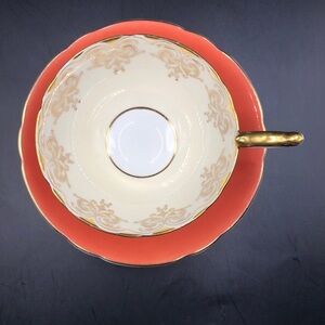 This is a really nice bold orange colour featuring a cream and white interior teacup adorned with heavy gold scrolls.