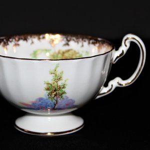 This gorgeous Aynsley set features a serene and tranquil woodlands setting of blossoming bluebells, pink flowers, birch trees, a meandering stream, and a pinkish-purplish horizon. Both the cup and saucer are adorned with this scenery, as well as an intricate gold leaf pattern along the rims. The beautiful Oban cup also has gold trim on the foot as well as the curvaceous handle.