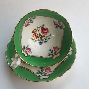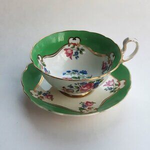 Aynsley Emerald Green Flowers Roses B3052 Pattern Teacup & Saucer England 1930s