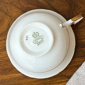 Description🌹 A small tea cup made of bone china by Aynsley. Unfortunately, without a saucer. The outside of the cup is white with gold accents. The design is inside. A bouquet of garden flowers is located in the center on a white background. The brim of the cup is ruby red with a rich ornament. The graceful handle is also decorated with gold.