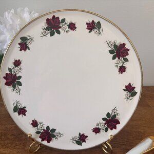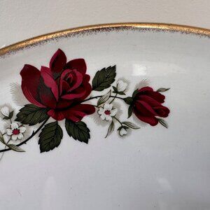 Ivory porcelain with deep red roses, green leaves, white flower accents, and metallic gold trim
