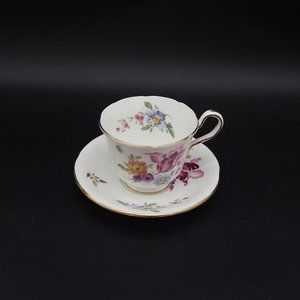 This is a teacup and saucer set made by Aynsley in Staffordshire, England likely in the 1960s. It is white with red, violet, orange and blue flowers, green leaves and gold trim. The same decoration is on the inside of the cup and there is beautiful gold trim on the rims and handle. It has seen little use and has no chips, cracks, crazing or fading.