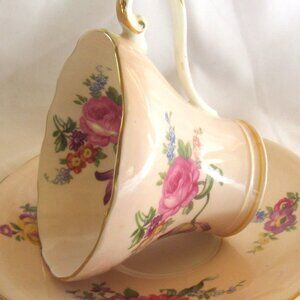 Aynsley Tea Cup and Saucer, Soft Beige and Spring Floral, Corset Shape, H28