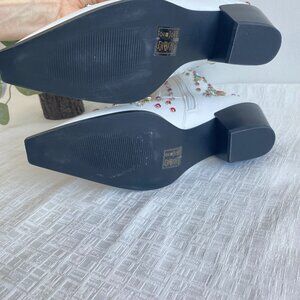 Stunning Azalea Wang Rhinestone Embellished Western Statement Boots SZ 10. White faux leather finish adorned with multicolour rhinestones & jewel embellishment, low block heel, side zipper closure, padded footbed. I wear sz 10 med width and these fit perfectly & are very comfortable, so they are true to size. I wore them once for an event, super minor signs of wear.