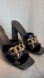 Azalea Wang black patent chunky heel gold chain open toe slide high heels Sz 9